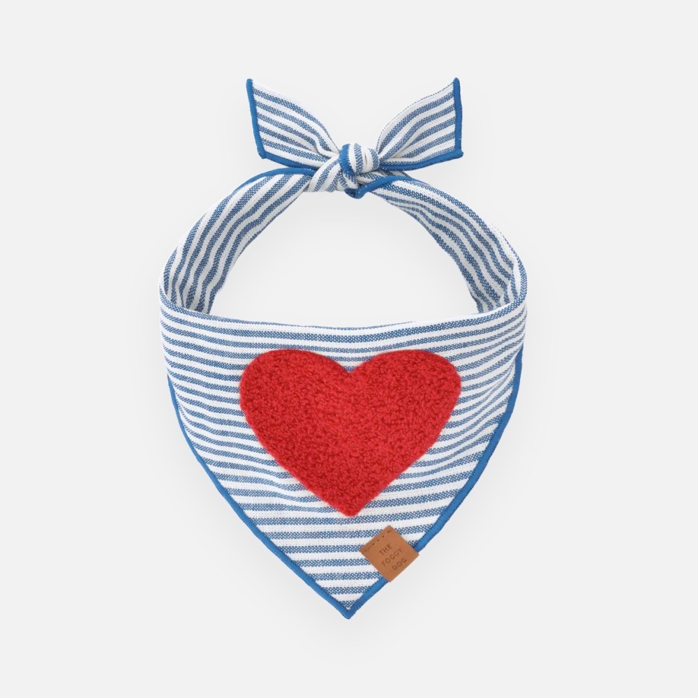 Ce bandana pour chien The Foggy Dog est un accessoire élégant et intemporel. Il se distingue par son motif marin à rayures et son coeur rouge moelleux en texture Sherpa, posé comme un symbole de d’amour et de tendresse sur le cou de votre compagnon.