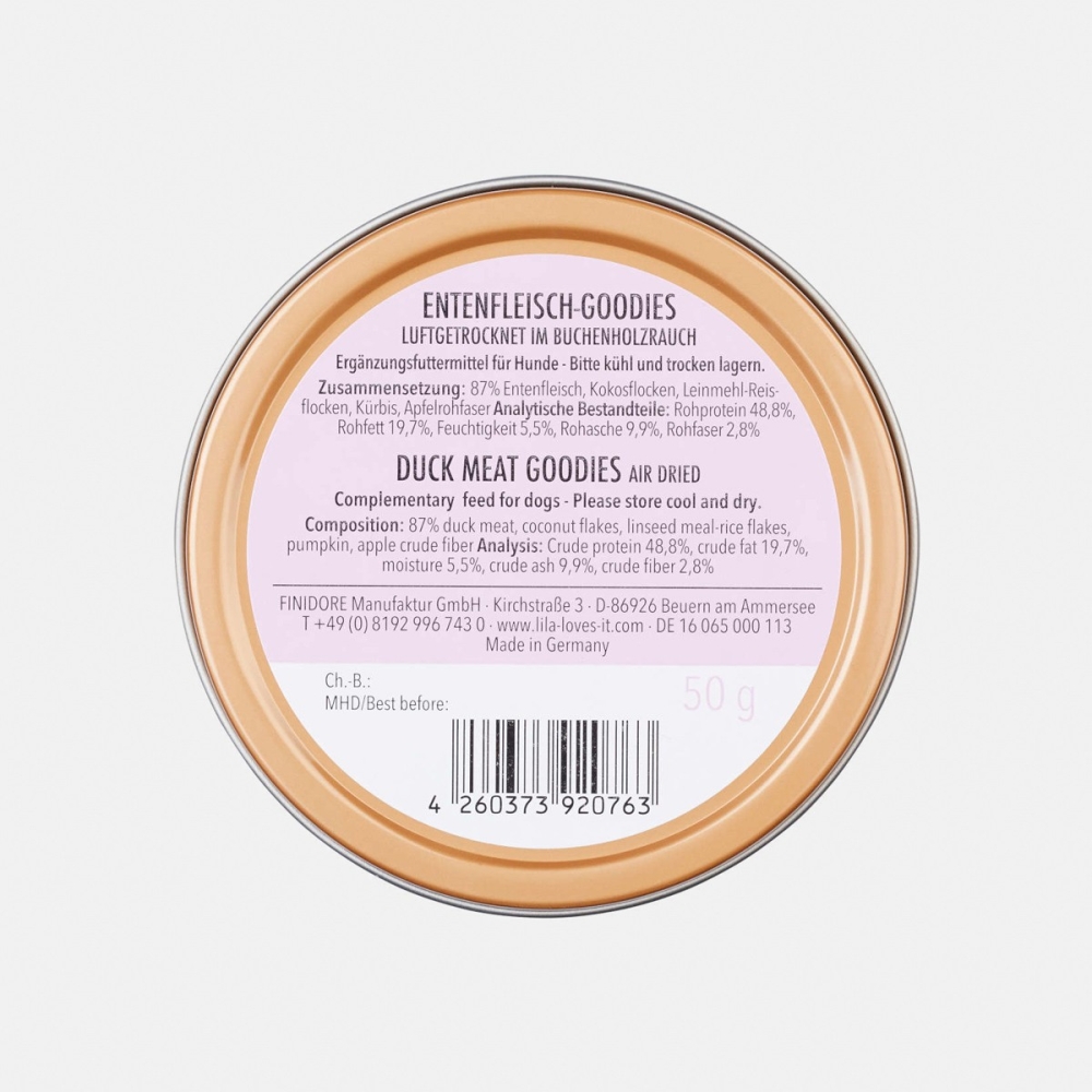 La recette est saine, savoureuse et entièrement naturelle : une forte teneur en viande de canard (87%), complétée par des flocons de noix de coco, de la farine de lin et de riz, des fibres de potiron et de pomme.