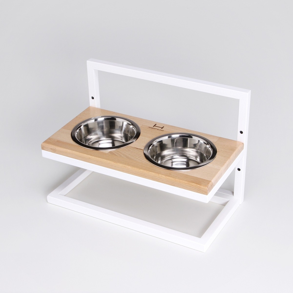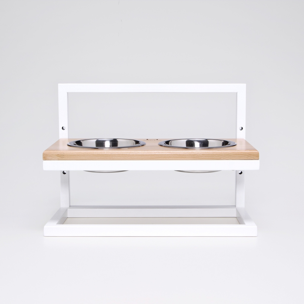 Entièrement démontables et disponibles en 2 tailles, ces gamelles surélevées se composent de 5 éléments : 2 bols en acier inoxydable (fournis), 1 base métallique solide, 1 plateau recevant les bols et 1 support vertical permettant de recevoir le plateau à différentes hauteurs. (Voir onglets « TAILLES » pour plus de précisions).