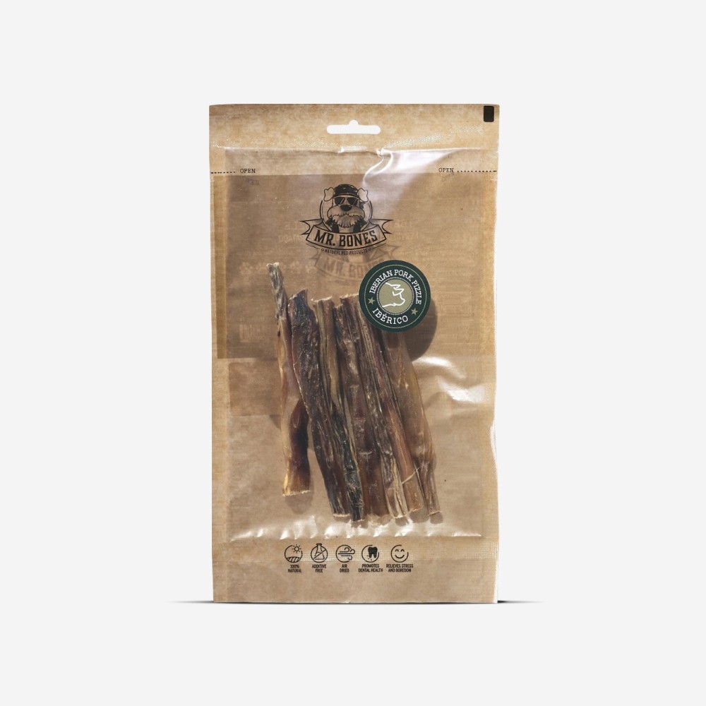Le Nerf de porc ibérique Mr Bones est une friandise masticatoire déshydratée entièrement naturelle, d’une dureté moyenne à faible. Elle est parfaitement adaptée aux chiens de petite à moyenne taille ou ceux qui découvrent la mastication.