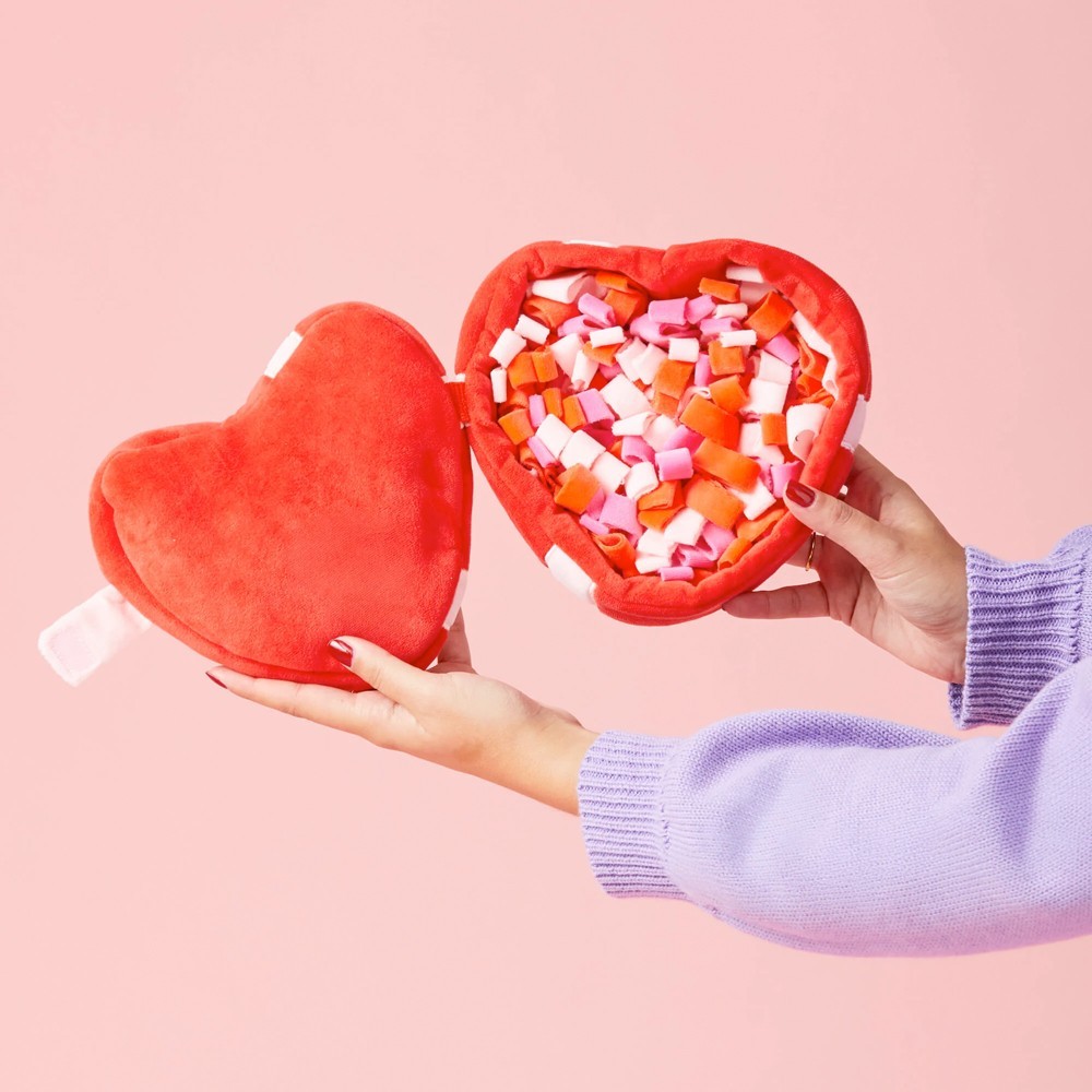 À mi-chemin entre une peluche de flair et un tapis de fouille, le coffret cadeau pour chien « Be My Valentine » par The Foggy Dog s’inspire de la célèbre boîte de chocolats en forme de cœur que l’on offre pour la Saint-Valentin. Un clin d’œil tendre et graphique, pensé pour faire plaisir à votre compagnon à quatre pattes.