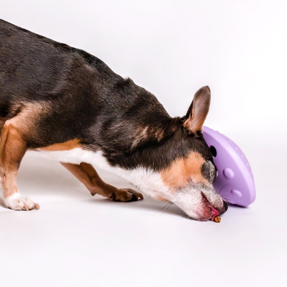 Pour une utilisation en mode casse-tête, elle peut être remplie de croquettes ou de friandises sèches. Une fois refermée, le chien doit manipuler, pousser et retourner la soucoupe pour faire tomber la nourriture par l’ouverture, mobilisant ainsi son flair, sa concentration et sa persévérance.