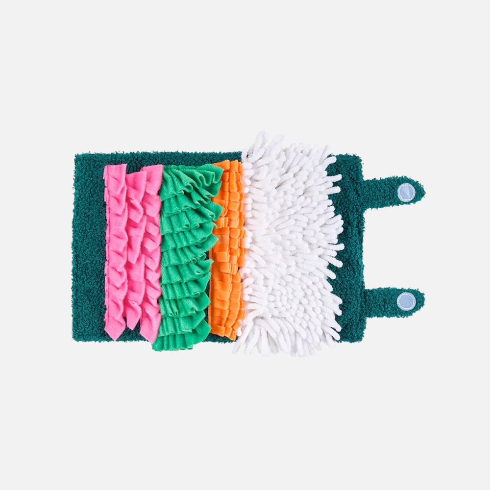 Il est composé de 4 différentes textures dans lesquelles vous pouvez cacher des friandises ou des croquettes. Lors de ce jeu de fouille, appelé aussi « nosework », votre compagnon se concentrera sur sa recherche de nourriture ; il travaillera ainsi son odorat, son intelligence et son habileté ! Le travail du flair est une excellente occupation pour stimuler sa réflexion et son intelligence ; il constitue une activité à part entière, dont la dépense énergétique favorisera l'apaisement et le sommeil réparateur de votre compagnon.