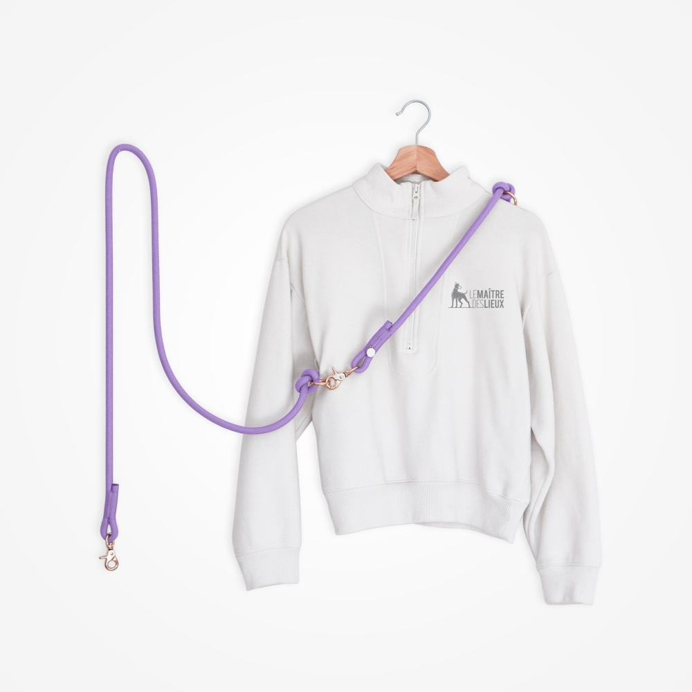 Les deux anneaux d’attache se déplacent grâce à un nœud coulissant ; vous pouvez ainsi porter votre laisse autour du torse en bandoulière, autour de la taille ou à la main… et l’ajuster selon vos préférences et vos mensurations.