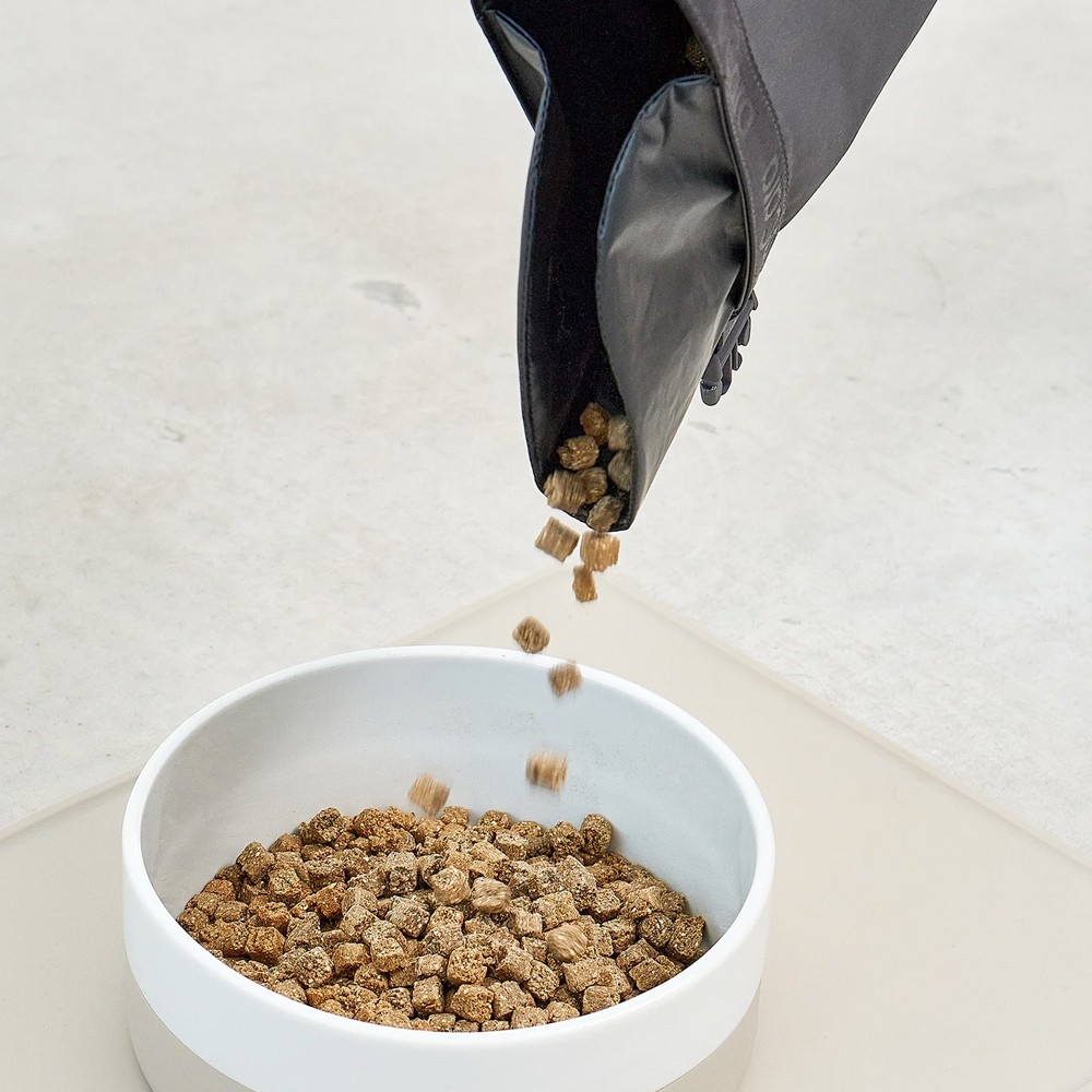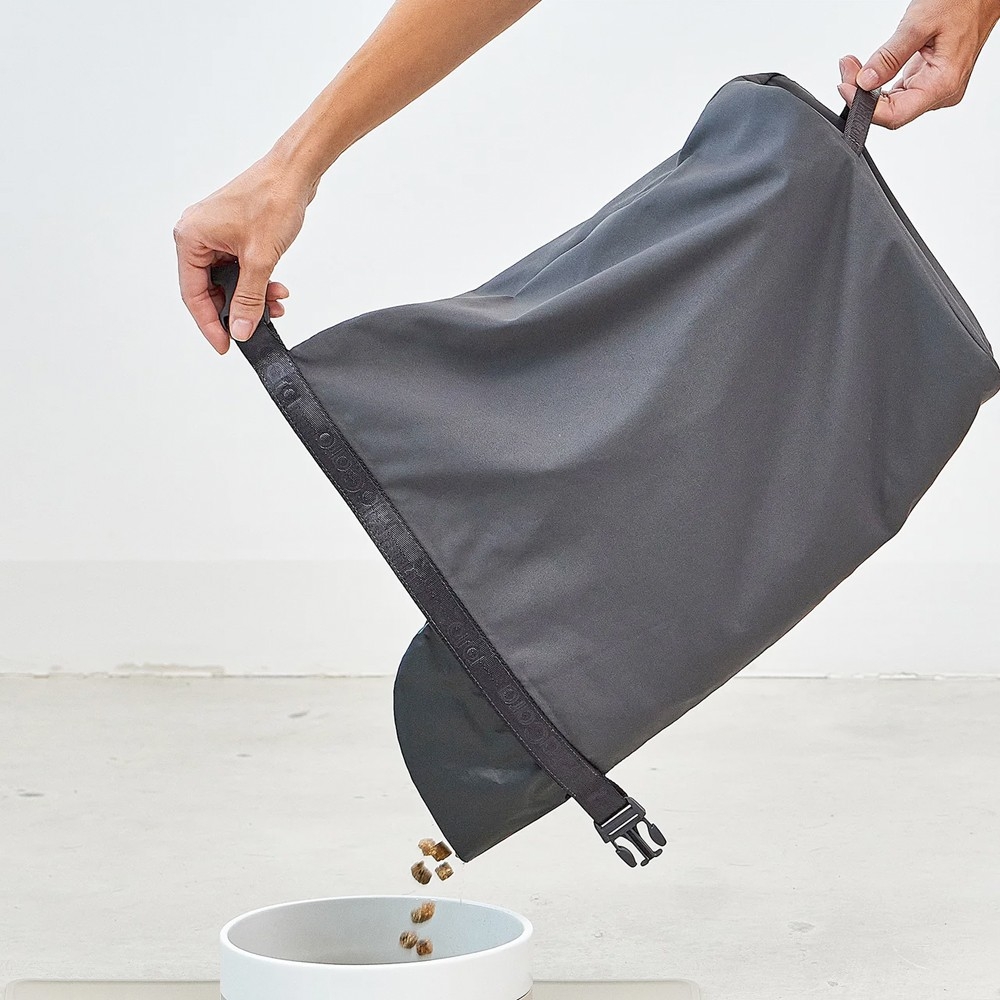 Grâce à sa fermeture intelligente à enroulement, Sacco permet un ajustement flexible en fonction de la quantité de nourriture qu’il contient. Un bec verseur rabattable, ainsi qu’une poignée ont également été prévus afin de verser et de portionner la nourriture sans tracas.