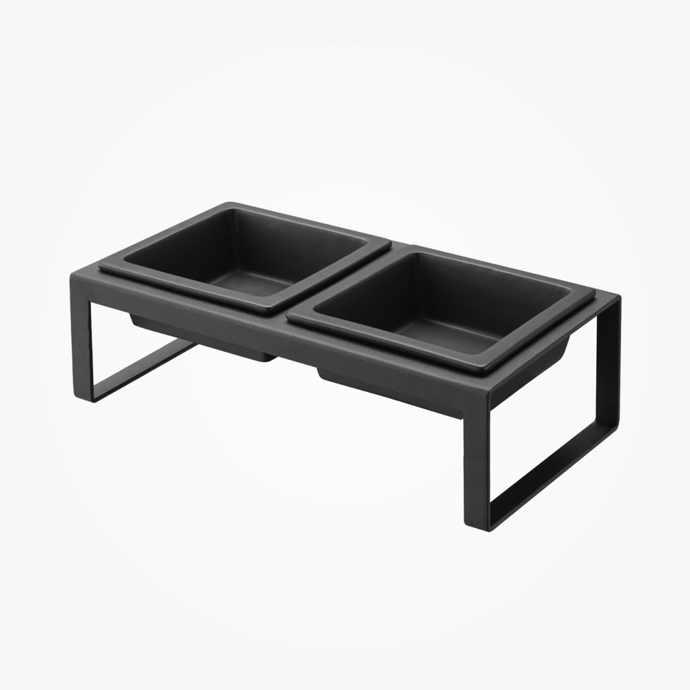 L'armature en acier enduite de poudre donne à la structure un aspect puriste, d’une extrême stabilité, ce qui convient à l’environnement intérieur et extérieur. Elle est également très facile à nettoyer. Les pieds anti-dérapants assurent une position ferme du support lors de son utilisation. Les bols inclus sont en céramique, de forme carrée, faciles à nettoyer et passent au lave-vaisselle.