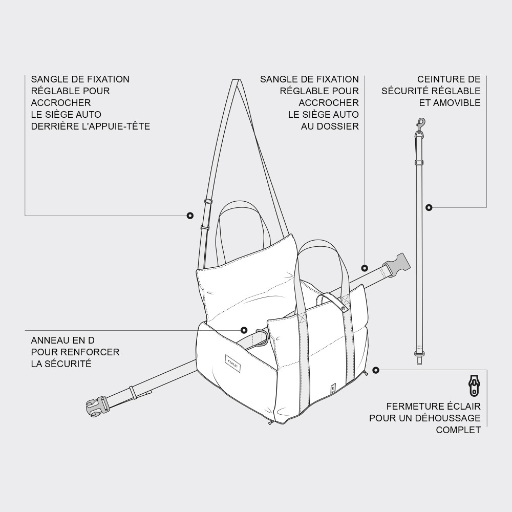Les fixations polyvalentes s’adaptent aussi bien aux sièges situés à l'avant qu’aux sièges situés à l'arrière du véhicule. En effet, une sangle réglable a été prévue pour l'appui-tête tandis qu'une autre peut se clipser derrière le dossier du siège avant. Une ceinture de sécurité est également à votre disposition pour se clipser dans le système d'accroche de votre véhicule. Enfin, un anneau en D a été fixé à l'intérieur du couchage afin de renforcer la sécurité.